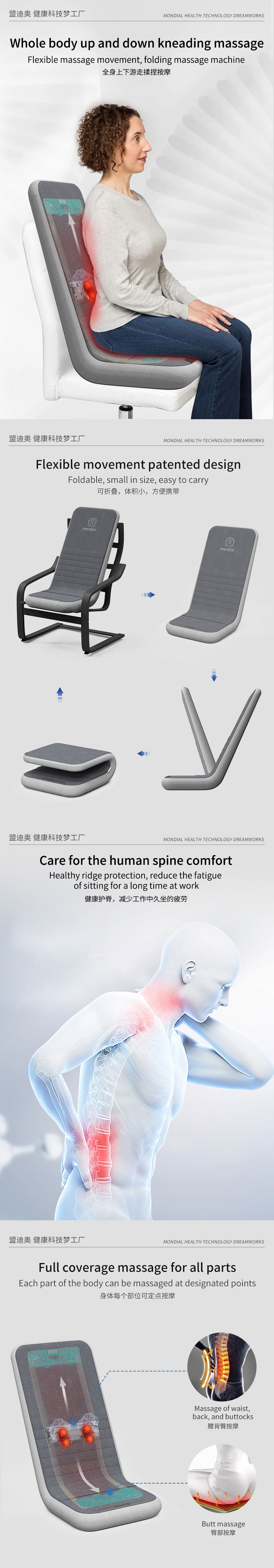 1、L型機(jī)芯結(jié)構(gòu),對(duì)折包裝縮小體積2、獨(dú)家專利柔性機(jī)芯3、力度三檔調(diào)節(jié),定點(diǎn)按摩,腰背按摩、臀腿按摩、全背按摩模式選擇4、背部行走揉捏,按摩區(qū)域加長(zhǎng)到從肩膀到大腿;5、更加貼合不同款式的椅子整體可對(duì)折收納6、亞馬遜標(biāo)準(zhǔn)包裝尺寸